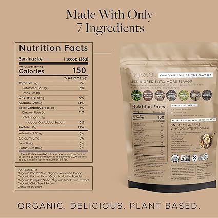 Truvani Organic Chocolate Peanut Butter Plant Based Protein, 25.75 oz