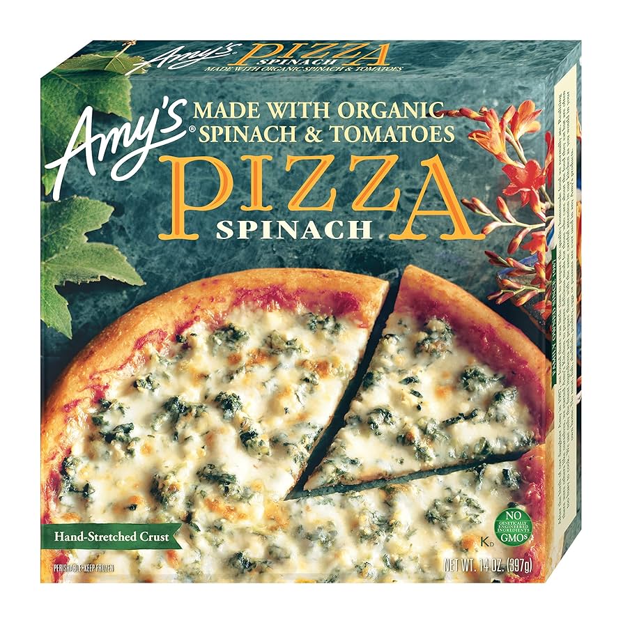 Amy's Frozen Pizza, Spinach Pizza, Made With Organic Spinach and Tomatoes, 14.0 oz, is a delicious and convenient meal featuring a crispy, hand-stretched wheat crust. Topped with organic spinach, tomatoes, and mozzarella cheese, this pizza offers a balanced and flavorful taste. It's made with organic ingredients and is vegetarian, making it a great option for those seeking a wholesome and easy-to-prepare meal. Perfect for a quick and satisfying lunch or dinner!