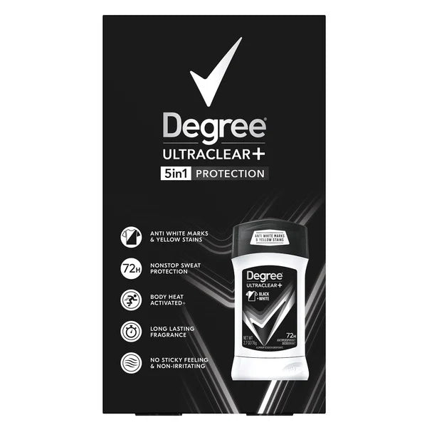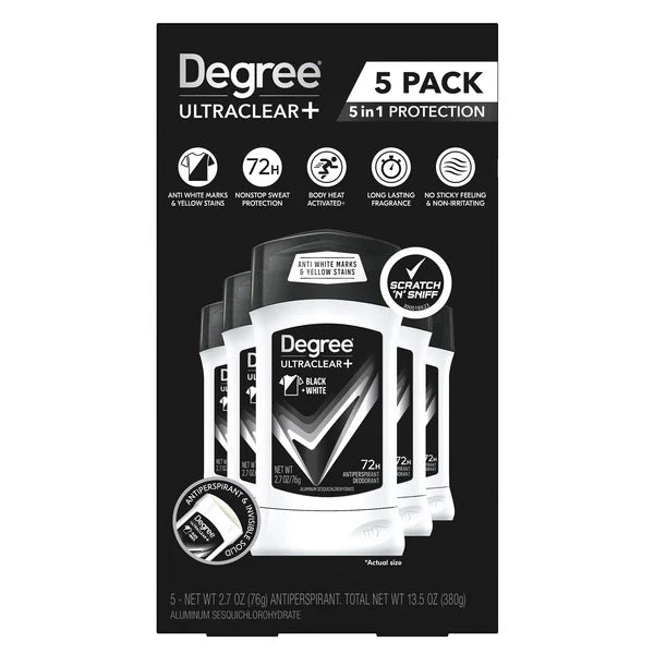 Degree Men UltraClear+ Antiperspirant Deodorant, Black & White, 2.7 oz, 5 Count is designed to provide powerful 72-hour sweat and odor protection while keeping clothes free from white marks and yellow stains. Infused with MotionSense technology, it releases bursts of freshness with movement, helping you stay confident and dry throughout the day. The clean, crisp scent and anti-stain formula make it a reliable choice for active lifestyles and everyday wear.