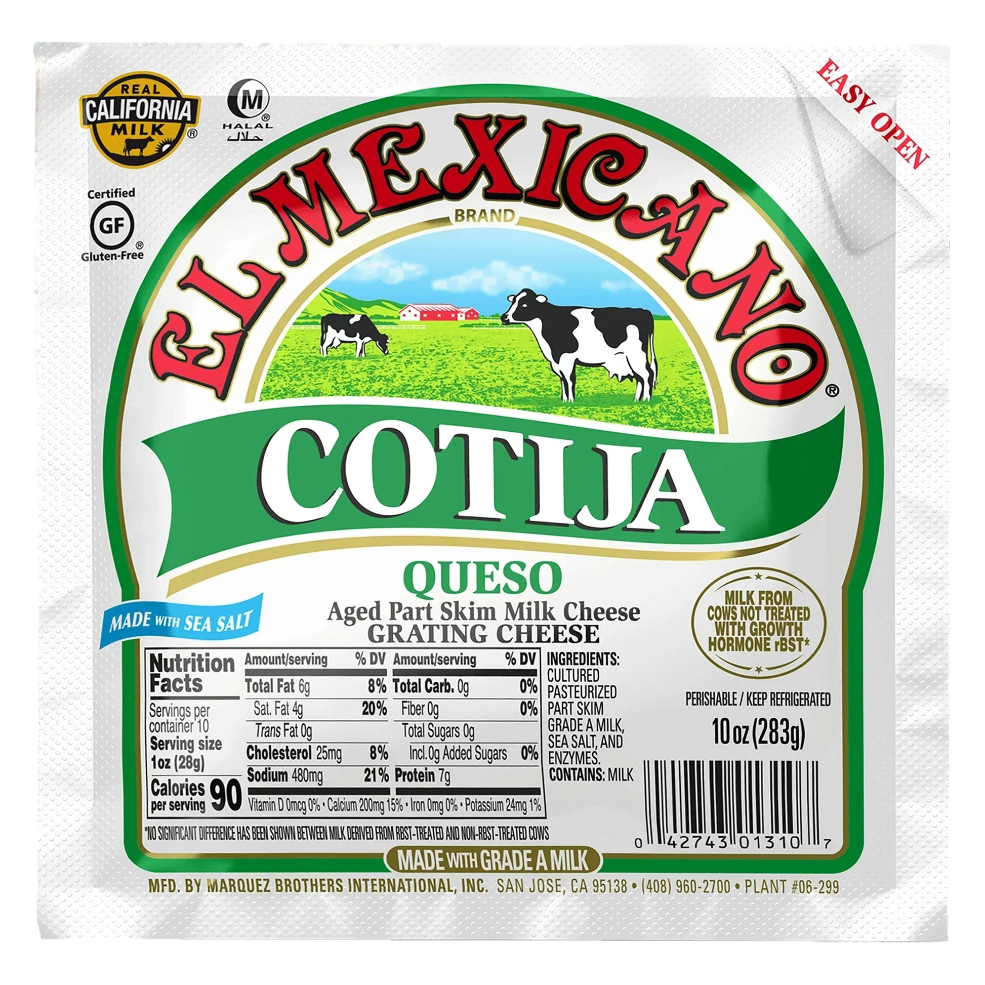 This semi-hard aged cheese offers a strong, salty flavor. It's made from natural ingredients like part-skimmed grade A milk and sea salt. Known as the "Parmesan of Mexico," it can be grated, crumbled, or sliced and is perfect for topping dishes like corn on the cob, guacamole, beans, tostadas, sopes, and tacos, or mixing into salad dressings and soups. This cheese is gluten-free, Halal-certified, and made from milk from cows not treated with rBST.