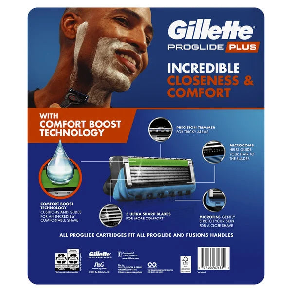 Gillette Proglide Plus Razor Cartridge Refills (16 Count) feature five anti-friction blades for a close, smooth shave, enhanced with a lubricating strip for added comfort. The precision trimmer on the back is ideal for edging and styling, while FlexBall technology helps the razor adapt to facial contours. Designed for durability, each cartridge delivers up to 20 shaves and fits all Gillette Fusion5 handles