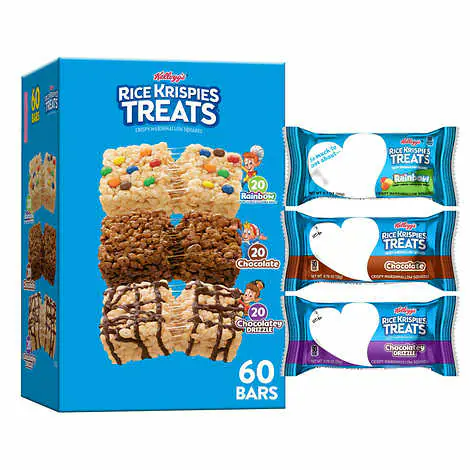 Kellogg's Rice Krispies Treats Variety Pack, 60 Count features an assortment of individually wrapped marshmallow squares in three fun flavors: Chocolatey Drizzle, Cocoa Krispies, and M&M-flavored treats. Each bar ranges from 0.7 to 0.78 oz and delivers a chewy, crispy texture with a sweet, nostalgic taste. Perfect for lunchboxes, party favors, or on-the-go snacking, this pack offers a playful mix that appeals to both kids and adults. With 60 treats in total, it’s ideal for sharing or stocking up your snack stash.