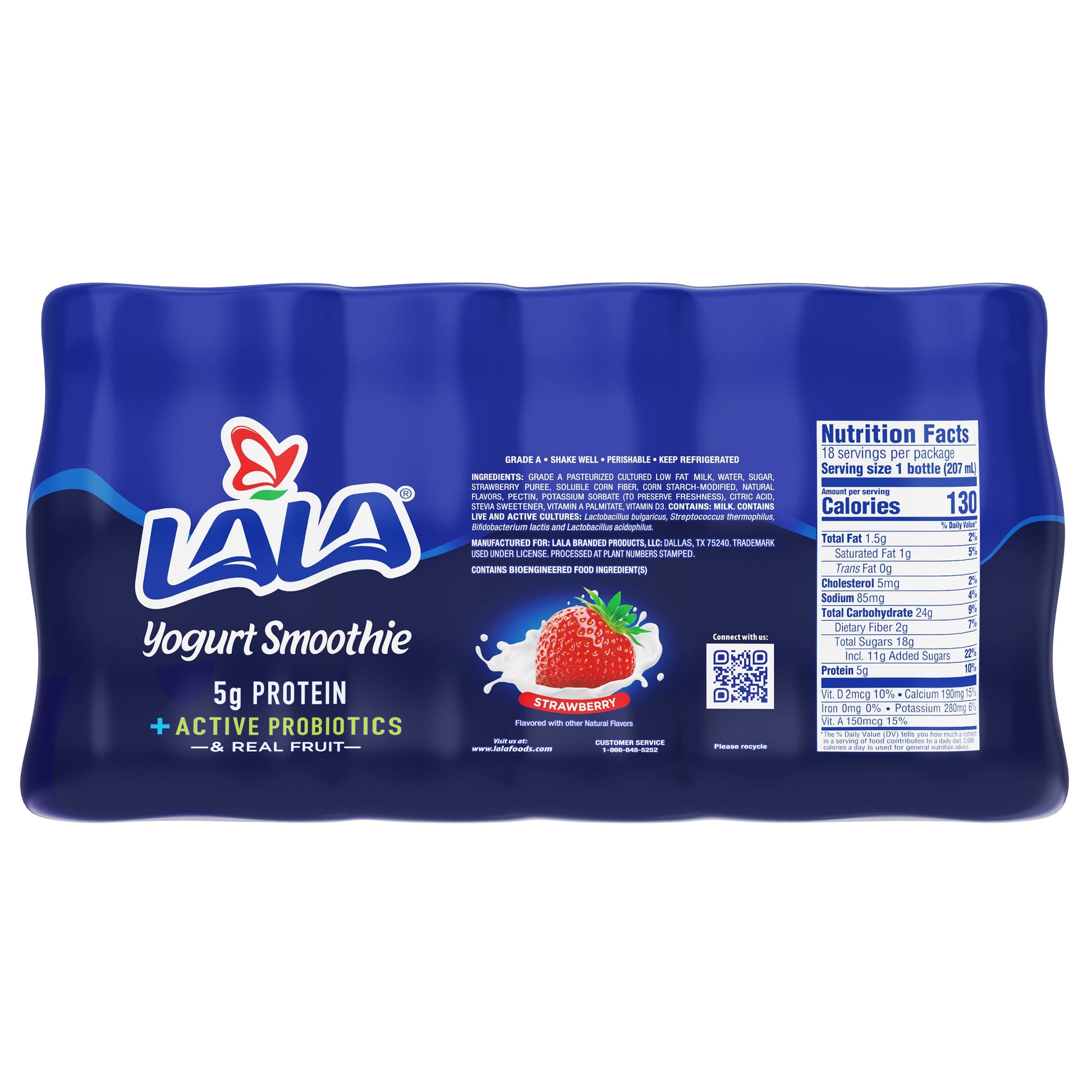 Lala Yogurt Strawberry Smoothie comes in an eighteen count pack of seven fluid ounce bottles designed for on the go consumption. Each smoothie features a creamy texture blended with the flavor of real strawberries to provide a convenient snack or breakfast addition.