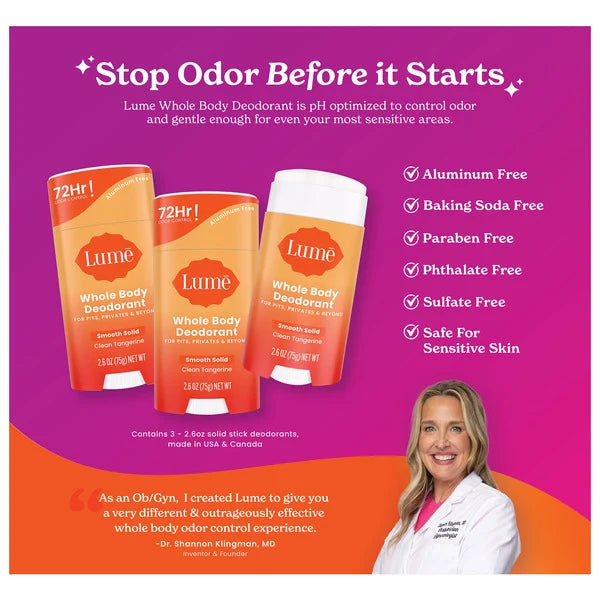 Lume Whole Body Deodorant (2.6 oz, 3-pack) offers 72-hour odor control for underarms, privates, feet, and other odor-prone areas. This smooth solid stick is aluminum-free, baking soda-free, and formulated with skin-safe ingredients, making it ideal for sensitive skin. The pack includes three scents—Clean Tangerine, Lavender Sage, and Unscented—so you can mix and match based on your mood. Developed by an OB/GYN, it's clinically proven to exfoliate and brighten skin while keeping you fresh from head to toe.