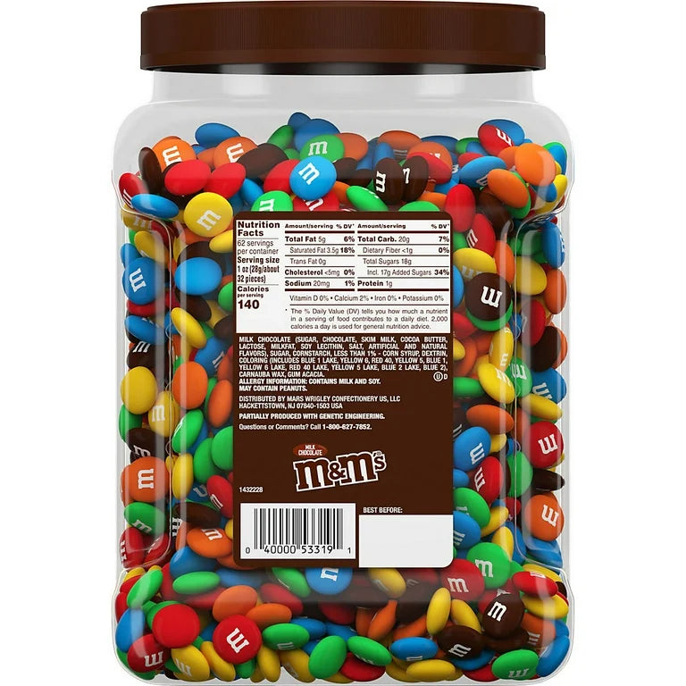 M&M's Milk Chocolate Candy in a 62 oz jar offers a generous supply of the classic, colorful treats loved by all ages. Each candy features a smooth milk chocolate center coated in a crisp candy shell. Perfect for parties, baking, or snacking straight from the jar, it's a fun and convenient way to satisfy your sweet tooth. The resealable jar keeps the candies fresh and easy to share.