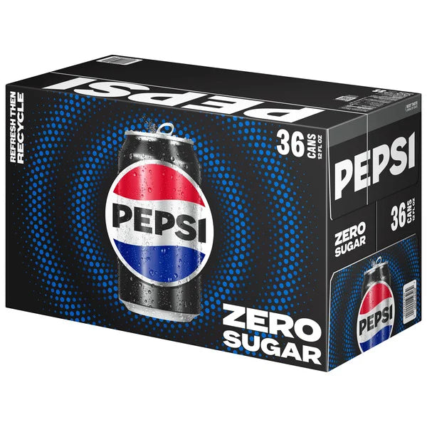 Pepsi Zero Sugar in a 36-count pack features twelve-ounce cans of bold, refreshing cola with zero calories, zero sugar, and zero carbs. Designed to deliver the classic Pepsi taste without the guilt, it's a popular choice for parties, meals, or everyday refreshment. Each can is caffeinated and contains ingredients like carbonated water, caramel color, phosphoric acid, and natural flavors, sweetened with aspartame and acesulfame potassium.