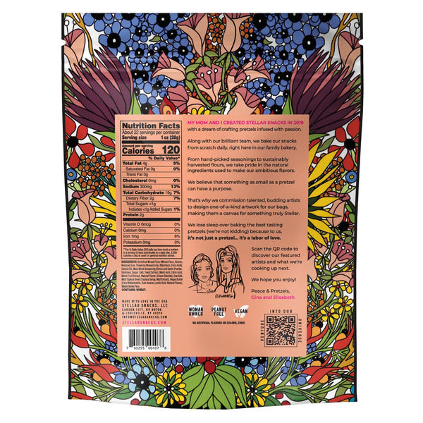 Stellar Maui Monk Pretzel Braids are artisanal, vegan snacks that blend savory and sweet flavors. This large 32 ounce bag contains pretzels seasoned with a signature Maui onion style profile and a hint of sweetness from monk fruit. Baked from scratch with sustainably harvested flour and vegan butter, these braided twists offer a gourmet crunch without artificial colors or corn syrup.
