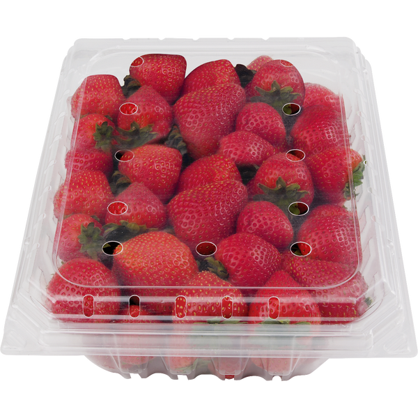 This 2 lb container of fresh strawberries features bright red fruit with a fragrant aroma and a sweet, juicy flavor.